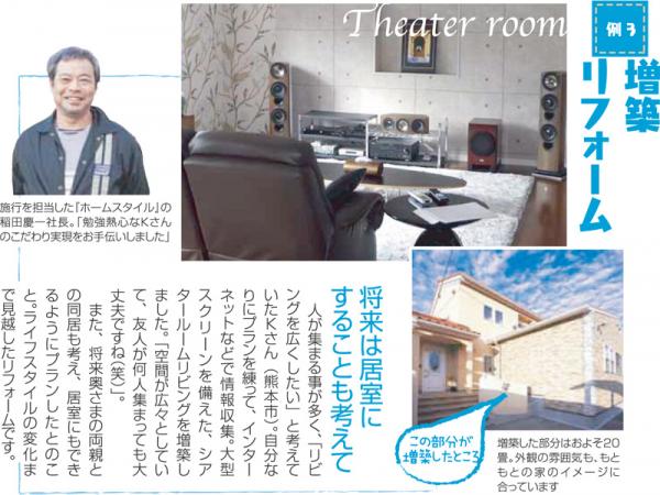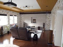 人が集まる事が多く、「リビングを広くしたい」と考えていたKさん(熊本市)。自分なりにプランを練って、インターネットなどで情報収集。大型スクリーンを備えた、シアタールームリビングを増築しました。「空間が広々としていて、友人が何人集まっても大丈夫ですね(笑)」。